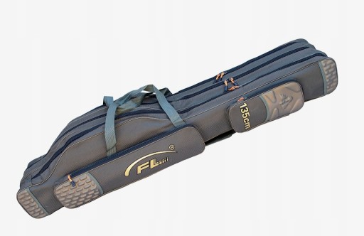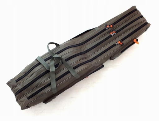 Pokrowiec wędkarski wygodny do noszenia na plecach przy pomocy szelek lub w ręku za uszy od góry. Z boku znajdują się dwie kieszenie o wymiarach jedna 61 x 14 cm,