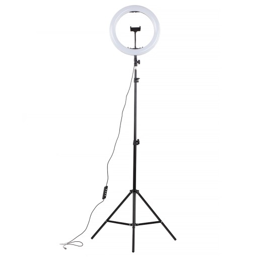 Do lampy w komplecie dodajemy lekki, uniwersalny, płynnie regulowany, dwusekcyjny, stabilny statyw o maksymalnej wysokości 210cm. Po złożeniu można go używać do oświetlania małych obiektów z bliska (minimalna wysokość 66cm). Posiada wygodne zaciski sekcji oraz uniwersalną głowicę mocującą 1/4”. Teleskopowy mechanizm składania zapewnia niewielkie wymiary po złożeniu.Oprócz lamp typu ring statyw może być używany do innego małego i średniego oświetlenia (udźwig do 1,5kg) takiego jak światło stałe, błyskowe, softboxy, lampy halogenowe.