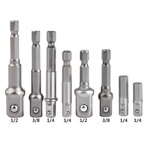 ✅ Kompletny zestaw 8 sztuk – adaptery do różnych rozmiarów kluczy nasadowych (1/4", 3/8", 1/2") w różnych długościach.