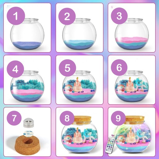 - ✨ Zawiera piasek, kryształki, jednorożce i inne dekoracje.