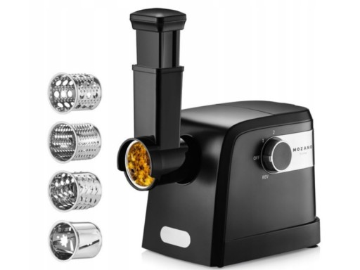 Maszynka do mięsa MOZANO Smash master 2000 ma w komplecie szatkownicę z czterema wymiennymi bębnami do krojenia, siekania i tarcia warzyw. Stal nierdzewna pomaga zachować trwałość i bezpieczeństwo w kontakcie z żywnością. Przykład: łatwo przygotujesz surówki, placki ziemniaczane, pokroisz warzywa na sałatki czy zetrzesz ser do zapiekanek.