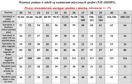 - Spodnie po przymierzeniu powinny być raczej "na ciasno" gdyż nowe spodnie mają tendencję do rozbijania (rozciągania) się po chwili używania o pół nawet do jednego rozmiaru.