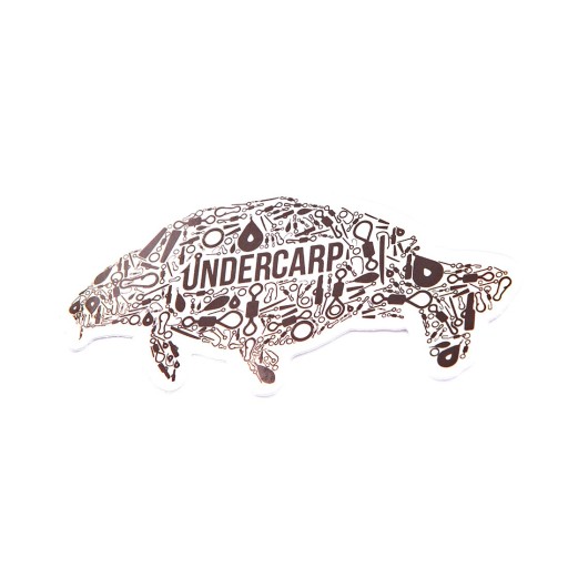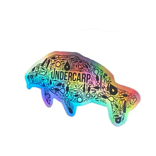 Naklejka w kształcie karpia stworzonego z akcesoriów karpiowych z logiem Undercarp wycięta po obrysie. Została wykonana z foli holograficznej samoprzylepnej odpornej na warunki atmosferyczne. Możesz nakleić ją między innymi na: samochód,wiadro,łódkę,ponton,pudełko,stolik,piórnik na przypony. W zależności od kąta ułożenia naklejki zmienia kolory.