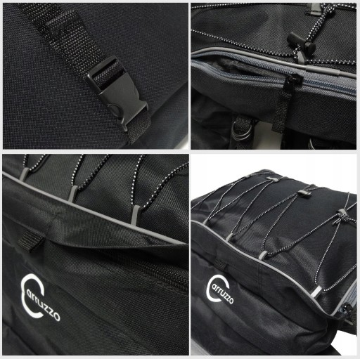 - gumy ze ściągaczami do mocowania dodatkowego bagażu (np. śpiwora, namiotu itp.) w górnej części sakwy