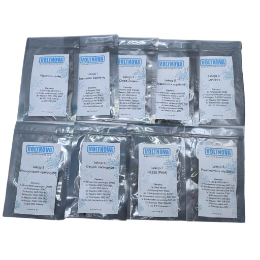 Zestaw zawiera specjalnie zaprojektowaną płytkę drukowaną oraz wszystkie elementy elektroniczne niezbędne do wykonania ćwiczeń. Podobnie jak w części pierwszej, każdy komponent jest przypisany do konkretnej lekcji i zapakowany w osobne woreczki.