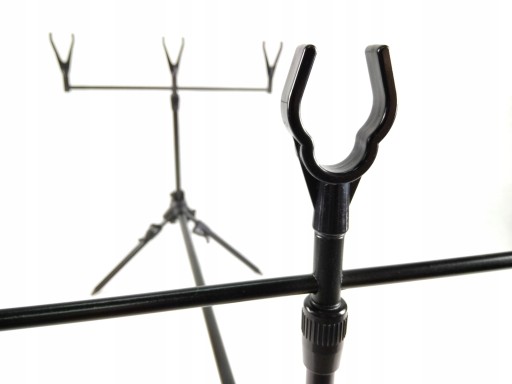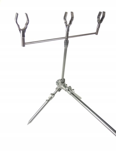Regulowane nóżki, dzięki czemu można go ustawić na nierównym podłożu. Można go rozsunąć i dostosować długość stojaka do wędek. W zestawie pokrowiec oraz widełki pod wędki.