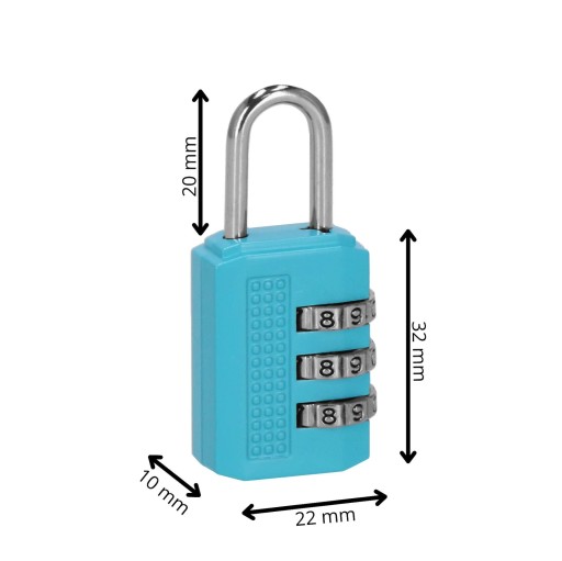 - Wymiary kłódki (bez zapięcia): 32 mm x 22 mm x 10 mm