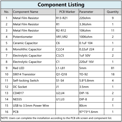 Układ ten ma matrycę punktową LED 9X9 umożliwia wyświetlanie różnych grafiki poprzez regulację dwóch potencjometrów. Grafika może poruszać się szybko lub powoli. Efekt wizualny polega na tym, że diody LED ścigają się nawzajem, więc nazywa się światłem śledzącym LED.