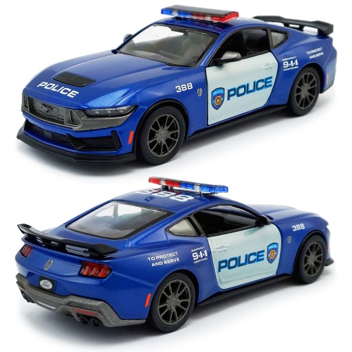 ⭐Model metalowy 2024 FORD MUSTANG DARK HORSE Policja w skali 1:38 z napędem typu ''Pull Back". Model wykonany z metalu i plastiku.