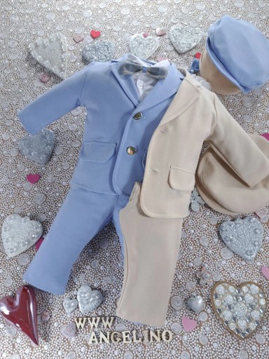 Garniturek składa się z pięciu elementów: marynarki, spodenek, kaszkietu, koszulo-body a także wygodnej muszki. Zapięcie marynarki na dwa złote guziczki, jeszcze bardziej dodaje jej klasycznego charakteru. Spodenki typu slim z gumką w pasie gwarantują, że maluszek będzie czuł się komfortowo przez cały dzień. Kaszkiet z daszkiem dopełnia eleganckiego wyglądu, nadając całości uroku.
