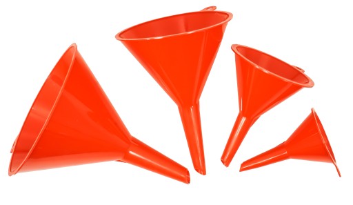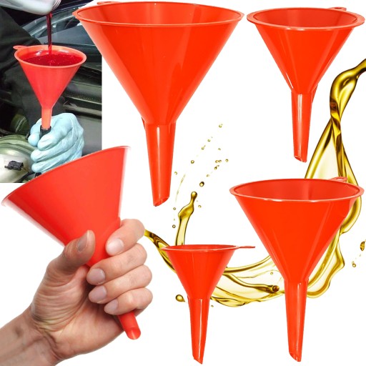 Zestaw 4 uniwersalnych lejków z tworzywa sztucznego o różnych średnicach (52, 75, 95, 115 mm). Przydatny w domu, garażu i warsztacie.
