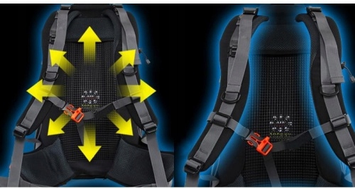 - To system zbudowany z siatki oddzielającej plecy od plecaka. Stelaż - wykonany z elastycznej stali stanowi "serce plecaka". Siatka która jest rozpięta na stelażu umożliwia wyjątkowo efektywną cyrkulację powietrza pomiędzy plecami a plecakiem w trzech kierunkach.