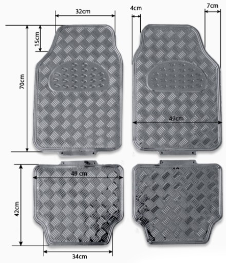 Zestaw 4 gumowych dywaników samochodowych o uniwersalnym rozmiarze.