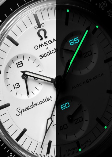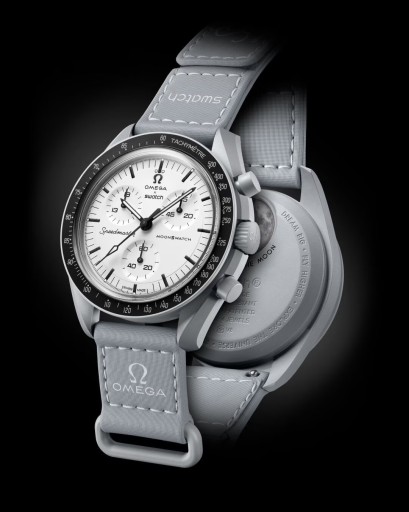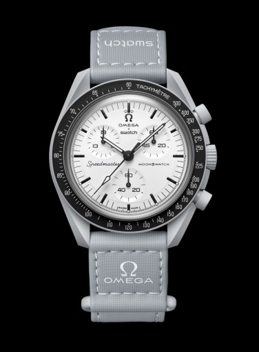 Ten zegarek z chronografem z nielimitowanej kolekcji wyposażony jest w kopertę, koronkę i przyciski z szarej bioceramiki oraz czarny pasek z rzepem VELCRO® i kontrastowym jasnoszarym przeszyciem oraz bioceramiczną szlufką. Ma białą tarczę i czarny bioceramiczny bezel z białą skalą tachymetru. Na tarczy są dwa wyjątkowe liczniki na godzinie 10 oraz 2. Pierwszy ma na górze liczbę 19 (zazwyczaj jest to 60), natomiast na drugim widnieje liczba 65 (zamiast typowej 10), co jest nawiązaniem do roku 1965. Liczniki te zostały skalibrowane na 19 godzin (licznik na godzinie 10) oraz 65 minut (licznik na godzinie 2), przez co odczyt jest nieco inny niż w typowych chronografach. Liczby 19, 65 i 60 (na liczniku na godzinie 6) świecą na niebiesko w świetle UV, oddając hołd OMEGA Speedmaster i kwalifikacji do lotów, którą otrzymał od NASA 60 lat temu, w 1965 roku. Na pokrywie baterii znajduje się przedstawienie Księżyca. Tarcza każdego zegarka z tej kolekcji posiada oznaczenia OMEGA X Swatch, kultowe logo Speedmaster oraz logo MoonSwatch. Wspólna dla wszystkich modeli jest również wypukła konstrukcja szkiełka z materiałów bio z wyrytą pośrodku literą „S”, odniesieniem do logo Swatch, drobny, wyrafinowany kolisty wzór na zewnętrznym pierścieniu tarczy i na wklęsłych subtarczach, gładkie uszy koperty o ostrych krawędziach i oczywiście wyjątkowy w dotyku materiał Bioceramic. Oznaczenia godzin, wskazówki godzinową i minutową oraz końcówkę wskazówki sekundowej chronografu pokryto jasnoszarą powłoką Super-LumiNova® klasy A (światło zielone), dla idealnej widzialności w ciemności.