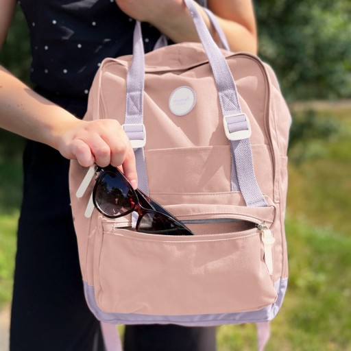 Plecak Himawari 1088 wykonano z trwałego i odpornego na deszcz materiału. W głównej komorze znajduje się osobna miękka komora na laptop w rozmiarze 15" oddzielająca przenoszony sprzęt od reszty rzeczy. Wewnątrz znajdują się także dodatkowe kieszenie np. na telefon lub inne akcesoria oraz siateczkowa kieszeń na drobiazgi zapinana na zamek. Z przodu plecaka znajduje się spora kieszeń zapinana na napę, poniżej której znajduje się kolejna, mniejsza kieszeń zapinana na zamek. Po bokach plecaka również umieszczono kieszenie na parasolkę lub napój. Plecak posiada dwie rączki, które można ze sobą spiąć zatrzaskiem - dzięki temu można plecak przenosić jak torbę w ręce np. podczas przejazdu w zatłoczonej komunikacji miejskiej. Dół plecaka wykonano z kontrastowego w kolorze materiału, który dzięki poddaniu impregnacji dodatkowo chroni plecak przed zamoczeniem czy zabrudzeniem go w wyniku np. odkładania na ziemię. Model ten wyróżnia się ciekawą kolorystyką, która przypadnie do gustu osobom młodym duchem lub wiekiem - doskonale sprawdzi się w szkole, jak i w czasie miejskich eskapad.