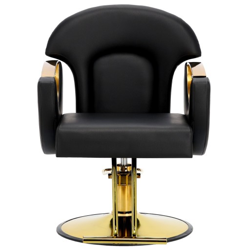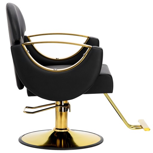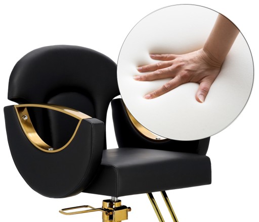 Fotel charakteryzuje się eleganckim i ergonomicznym designem, który pozwala na wygodną pracę fryzjera oraz relaks klientów.