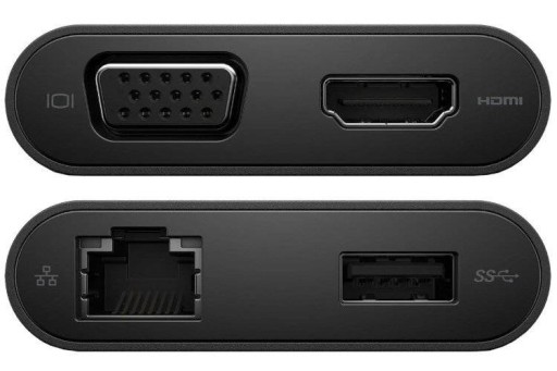 Kompaktowy adapter Dell — z USB-C do HDMI/VGA/Ethernet/USB 3.0 to rozwiązanie typu plug-and-play umożliwiające podłączenie notebooka do zewnętrznego wyświetlacza i innych potrzebnych urządzeń.