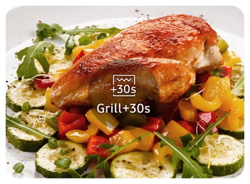 Przycisk Grill +30s wydłuża czas pracy mikrofali o 30 sekund i opieka jedzenie przy pomocy grzałki grilla. Pomaga to osiągnąć idealną teksturę i barwę potraw, aby wyglądały i smakowały jeszcze lepiej.