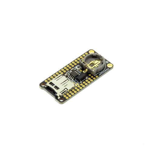 Rejestrator danych dedykowany do płytek Feather. Wyposażony został w zegar RTC, gniazdo baterii CR1220 oraz gniazdo kart micro SD. Sprawdzi się jako moduł do zapisywania danych z pracy urządzenia (pomiarów z czujników, danych GPS). Pełna dokumentacja dostępna jest na stronie produktu.