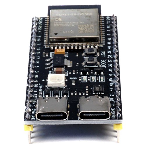 ESP32-S3-DevKitC-1 w wersji N16R8 posiadający rozszerzoną pamięć FLASH do 16MB oraz PSRAM do 8MB. Ten wydajny mikrokontroler bazuje na 32-bitowym procesorze Xtensa LX7 o dwóch rdzeniach i częstotliwości 240 MHz. Do naszej dyspozycji dostajemy 2 porty USB-C - jeden do połączenia po UART, drugi do komunikacji i zasilania modułu. Na płytce znajdziemy diodę LED RGB WS2812B umożliwiającą podstawową komunikację z użytkownikiem, dwa przyciski: BOOT i RESET i diody statusów: zasilania oraz transmisji UART.