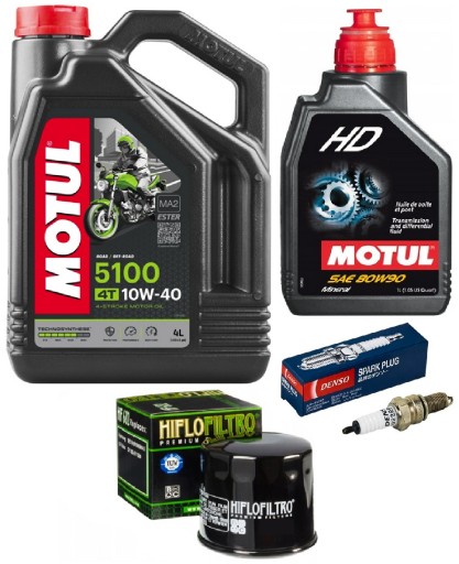 FABRYCZNIE NOWY ZESTAW PÓŁSYNTETYCZNEGO OLEJU SILNIKOWEGO 10W40 W WERSJI 5100 FIRMY MOTUL, MINERALNEGO OLEJU PRZEKŁADNIOWEGO HD 80W90 FIRMY MOTUL, FILTRA OLEJU FIRMY HIFLO ORAZ JAPOŃSKIEJ ŚWIECY ZAPŁONOWEJ FIRMY DENSO