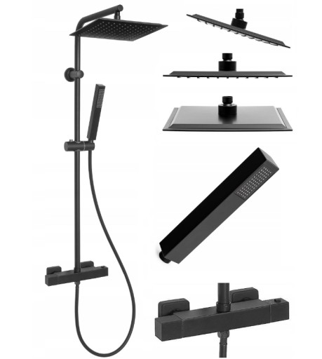 - Zawartość zestawu: drążek, 2 uchwyty montażowe drążka wraz z zestawem montażowym, deszczownia górna, słuchawka, uchwyt słuchawki, wąż natryskowy, bateria termostatyczna, zestaw mocujący baterię wraz z rozetkami maskującymi