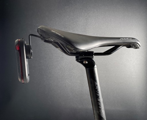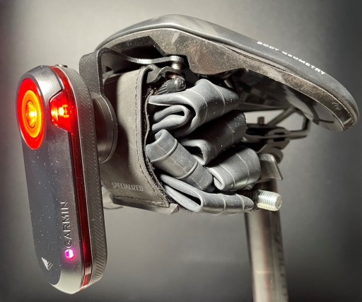 Uchwyt K-MOUNT GR18 umożliwia montaż radaru GARMIN VARIA RTL515 do siodełka SPECIALIZED, z systemem SWAT, w taki sposób, że mieści się również podsiodłówka (na zdjęciu torba podsiodłowa BONTRAGER Elite S, pojemność 0,65l)