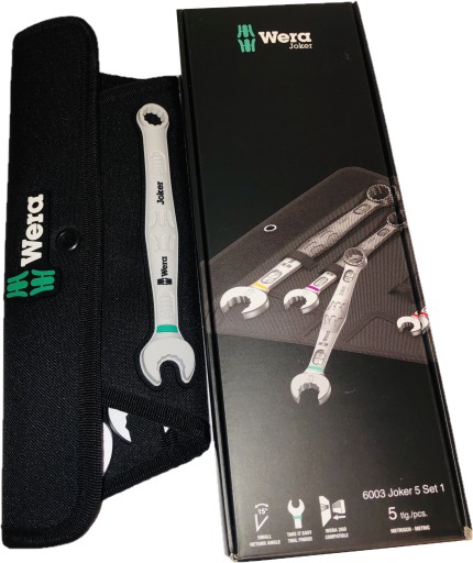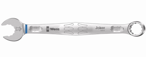 Ponieważ coraz więcej jest sytuacji, w których przestrzeń montażowa jest bardzo ograniczona, potrzebne są narzędzia, za pomocąktórych użytkownicy będą mogli z powodzeniem pracować również w takich warunkach. Wąskie przestrzenie montażowe wymagajądodatkowych punktów osadzenia dla narzędzi. Połączenie szczęki odchylonej pod kątem 7,5° i podwójnej geometrii sześciokątnej podwaja liczbę punktówosadzenia. Podczas kilkukrotnie powtarzanych obrotów o 180° wokół osi wzdłużnej możliwe jest osadzenia klucza co 15° na nakrętcelub łbie śruby. Klucz Joker 6003 z przemyślaną geometrią szczęk znacznie rozszerza zakres zastosowań w wąskich przestrzeniach.Joker 6003 automatycznie odnajduje odpowiedni punkt podparcia po każdym obrocie. Smukła, a jednocześnie wytrzymała stronaoczkowa klucza jest odchylona pod kątem 15° w stosunku do osi narzędzia. Wysokiej jakości powierzchnia zapewnia bardzo dobrą idługotrwałą ochronę antykorozyjną. System wyszukiwania narzędzi Wera "Take it easy": system oznaczenia kolorystycznego kluczywedług rozmiaru. Torby Joker nadają się do montażu na ścianie, półce, wózku warsztatowym, a dzięki rzepom są kompatybilne zsystemem Wera 2go.