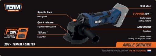 FERM AGM1125 Szlifierka Kątowa 115mm 20V – Mobilność i Wydajność w Jednym!