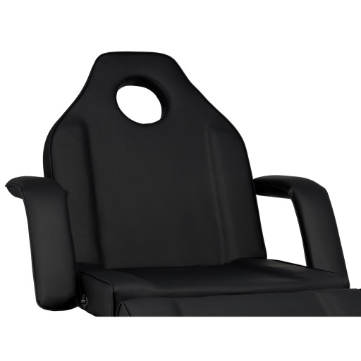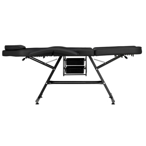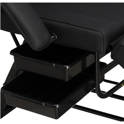 Wysuwana kuweta zapewnia łatwy dostęp do najpotrzebniejszych akcesoriów. Materiał jest trwały, łatwy do czyszczenia i pomaga utrzymać porządek w miejscu pracy. Otwór na zagłówek jest ukryty pod odpowiednio wyprofilowaną poduszką, dzięki czemu idealnie nadaje się do masażu.