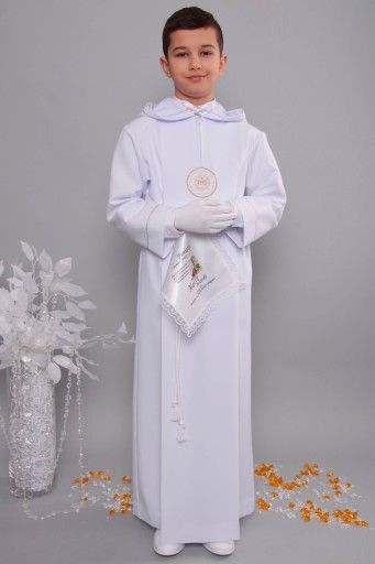Ładna, klasyczna długa alba komunijna dla chłopca z kapturem. Wzór alby dla chłopca, który jest widoczny na zdjęciu uszyty jest z gabardyny. Model tej alby komunijnej ozdobiony jest na rękawach i kapturze złotą nitką.