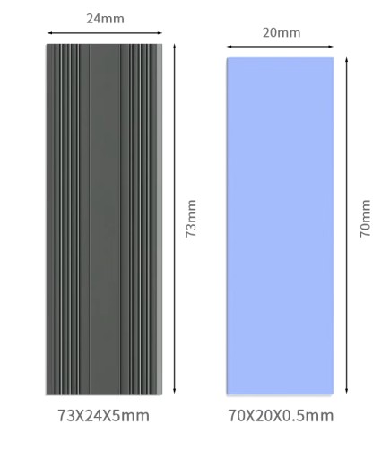 Radiator ma 73 mm długości, 24 mm szerokości i 5 mm grubości, co czyni go kompatybilnym z większością dysków SSD M.2 NVMe w standardzie 2280.
