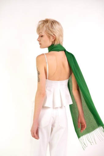 Minimalistyczny, cienki szal o prostym kroju, wykończony frędzlami.