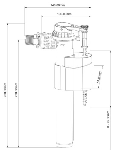 Wymiary zaworu napełniającego z zamontowanym gwintem do dolnego napełniania: