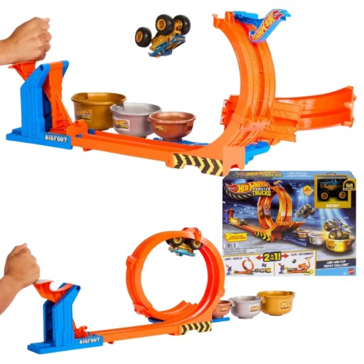 Gotowy na ekstremalne emocje i niesamowite wyzwania? Hot Wheels Monster Trucks Tor Pętla Skok Po Trofeum to zestaw, który sprawi, że każda zabawa zamieni się w ekscytujące mistrzostwa kaskaderskie!