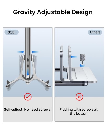 - 【Projekt blokady grawitacyjnej, automatyczna regulacja】Pionowy stojak SODI żegna się z tradycyjnymi metodami ręcznej regulacji śrub, sprytnie wykorzystuje wagę obiektu, sam dostosowuje szerokość do różnych rozmiarów laptopów. Po prostu umieszczając go na tym uchwycie dla MacBooka, laptop automatycznie się blokuje.