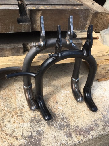 Nowy stojak centralny do motocykli M72, BMW R51, R61, R66, R71, wykonany bardzo solidnie: "buty" - tłoczone z dwóch kawałków, górne mocowanie wykonane z blachy 6 mm, otwór na oś wiercony, kąty "butów" takie, jak w oryginale. Dodatkowo ostatnie zdjęcia są porównawcze z oryginalnymi. Cena dotyczy 1 sztuki.