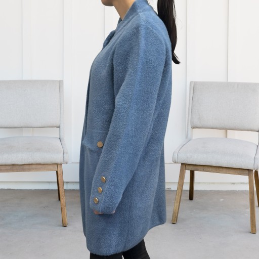Płaszcz wykonany z bardzo modnego, ciekawego, niezwykle przyjemnego materiału.