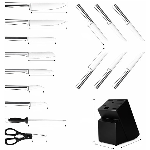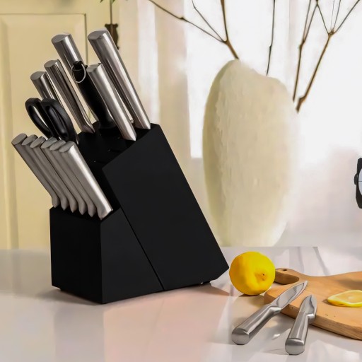 ✔️ Nasz komplet z blokiem na noże zawiera 15 elementów, które pomogą utrzymać porządek, mając wszystkie noże w jednym miejscu, zawsze gotowe do pracy.