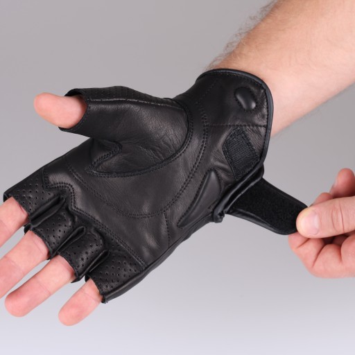 Stylowe, solidne, bardzo dobrze oddychające rękawice bez palców, o krótkim fasonie. Wysokiej jakości rękawice motocyklowe, wyprodukowane z najlepszej jakości skóry bydlęcej z twardym ochraniaczem kostek.