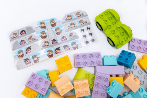 2. Oprócz klasycznych elementów o różnych kształtach, zestaw zawiera podwozia z kołkami oraz kolorowe naklejki (oczka, postacie), które wzbogacą stronę wizualną konstrukcji.