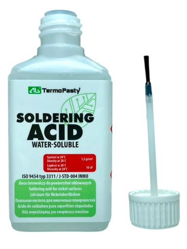 Proces użycia jest wyjątkowo prosty, a przede wszystkim efektywny. Niewielka ilość kwasu nałożona na lutowaną powierzchnię zapewnia silne i trwałe połączenia. Po zakończeniu pracy wystarczy opłukać miejsce lutowania w ciepłej (ok. 50°C), dejonizowanej wodzie, używając przy tym miękkiej antystatycznej szczoteczki do usunięcia osadów. Następnie spłukujemy miejsce mycia zimną wodą, aby usunąć pozostałości, a także zapobiec osadzaniu się resztek (Water-soluble). Aby uzyskać lepszy efekt, użyj Zmywacza PCB wodnego, skuteczniejszego niż zwykła woda dejonizowana – zapobiega korozji oraz zanieczyszczeniom na lutowanych elementach.