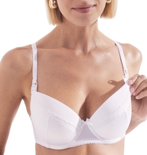 Piękny i bardzo kobiecy biustonosz ciążowy oraz do karmienia - MaMa Kelly, polecany dla mniejszych i średnich biustów. Miseczka na certyfikowanej fiszbinie, podtrzymuje i delikatnie modeluje piersi. Model usztywniony zostały cienką, elastyczną pianką gorseciarską. Biustonosz to połączenie żakardowej satyny i gładkiej dzianiny. Wzdłuż poziomego cięcia poprowadzono delikatną koronkę. Od środka, miseczka obszyta została 100% bawełną o wykończeniu antybakteryjnym. Zapięcie miseczki Quick-Click, zapewnia wygodę przy karmieniu maleństwa, dając Ci możliwość odpięcia jej jedną ręką. Obwód biustonosza w zależności od rozmiaru ma zapięcie 3 lub 4-stopniowe, na 2 lub 3 rzędy haftek, abyś mogła długo cieszyć się stabilnym obwodem swojej bielizny. Pomiędzy miseczkami ozdobna kokardka.