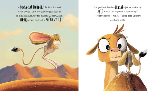 Na pustyni wstaje nowy dzień. Stado wielbłądów wyrusza na poszukiwanie oazy, by się napić i pobawić. Mały wielbłąd obudził się w złym humorze. Nie ma siły i jest mu bardzo gorąco, więc nie zamierza spacerować w upale! I nic, ABSOLUTNIE NIC, nie wprawi go w lepszy nastrój i nie zachęci do działania. A może jednak? Czy najweselsze stworzenie na pustyni będzie w stanie mu pomóc?Wielbłąd, który marudził to kolejny picturebook autorstwa Jima Fielda i Rachel Bright (autorów m. in. bestsellerowych Mysz, która chciała być lwem, Koala, który się trzymał, Wiewiórki, które nie chciały się dzielić). Obok mistrzowsko przetłumaczonej przez Basię Supeł rymowanej historii główną rolę odgrywają w nim ilustracje. Niezależnie od wieku trudno oprzeć się wesołej szacie graficznej oraz pogodnej historii, która dodatkowo zostawia czytelnika z nienachalnym, a bardzo ważnym przesłaniem.