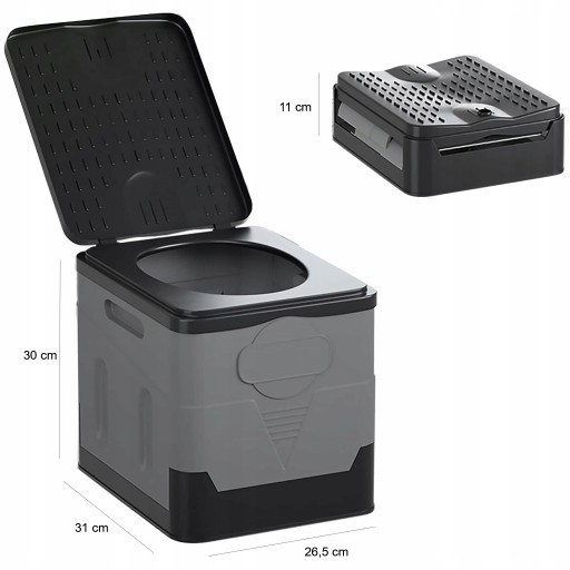 - Wymiary złożonej toalety: 11 x 31 x 26,5 cm