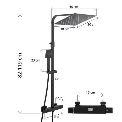 Zestaw zawiera baterię prysznicową z termostatem oraz kolumnę prysznicową wraz z deszczownicą i słuchawką