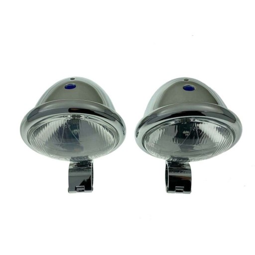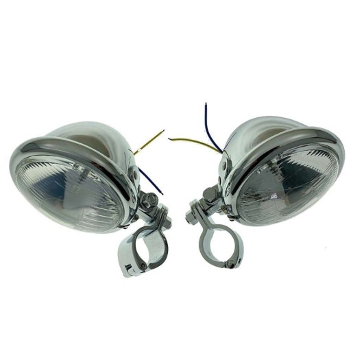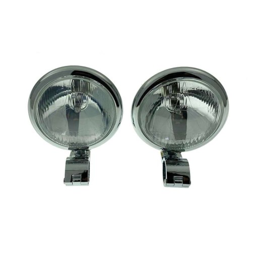 - Lampy i obejmy są chromowane. Zaopatrzone są w żarówki H3 12V 55W oraz kontrolkę świecącą na niebiesko sygnalizującą świecenie lamp. Posiadają homologację europejską. Obejmy są bardzo solidne, skręcane z trzech części. Zestaw umożliwia zamocowanie lamp na gmolu przednim oraz ustawienie kąta padania światła.