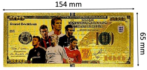 Pięknie wykonany z PCV banknot z wizerunkiem BECKHAMA powlekany folią w kolorze złota.