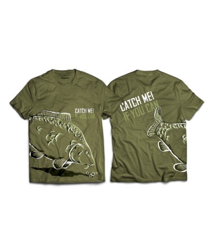 Seria stylowych T-shirtów. CATCH ME IF YOU CAN (złap mnie jeśli potrafisz)z obrazem karpia to niezwykły element w szafie wędkarza. Obrazek karpia obejmuje przednią i tylną dolną część. Karp jest przedstawiony jako szkic, zachowując wszystkie ważne szczegóły. Ryba zostaje złapana w sytuacji, w której zbliża się do garści przynęt kulek proteinowych.