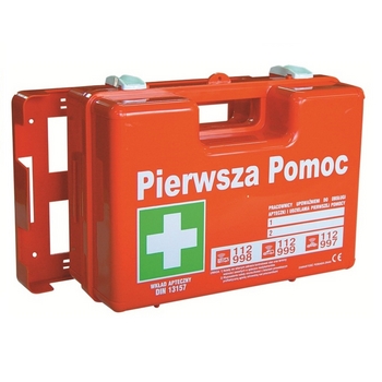 Apteczka przemysłowa z wyposażeniem DIN 13157 (dodatkowo ustnik do sztucznego oddychania, chusteczki dezynfekujące oraz stelaż mocujący do ściany). Apteczka nadająca się do biur, szkół i większych zakładów pracy. Skład apteczki: 1 szt. Kompres zimny 2 szt. Kompres na oko 3 szt. Kompres 10 x 10 a2 2 szt. Opaska elastyczna 4 m x 6 cm 2 szt. Opaska elastyczna 4 m x 8 cm 1 kpl. Plaster 10 x 6 cm (8 szt.) 1 kpl. Plaster (14 szt.) 1 szt. Plaster 5 m x 2,5 cm 3 szt. Opatrunek indywidualny m sterylny 1 szt. Opatrunek indywidualny g sterylny 1 szt. Opatrunek indywidualny k sterylny 1 szt. Chusta opatrunkowa 60 x 80 2 szt. Chusta trójkątna 1 kpl. Chusta z flizeliny (5 szt.) 1 szt. Koc ratunkowy 160 x 210 cm 1 szt. Nożyczki 19 cm 4 szt. Rękawice latex 6 szt. Chusteczka dezynfekująca 1 szt. Ustnik do sztucznego oddychania 1 szt. Instrukcja udzielania pierwszej pomocy wraz z wykazem telefonów alarmowych